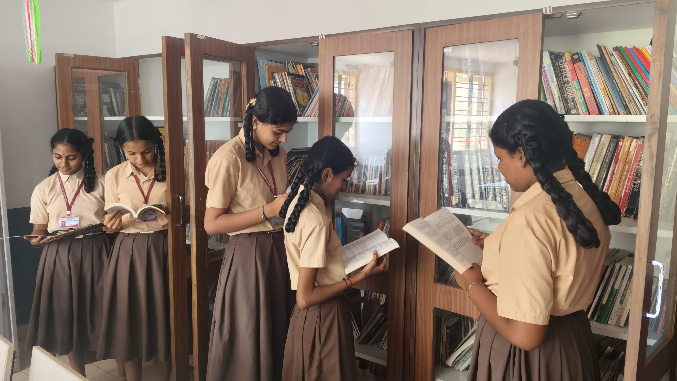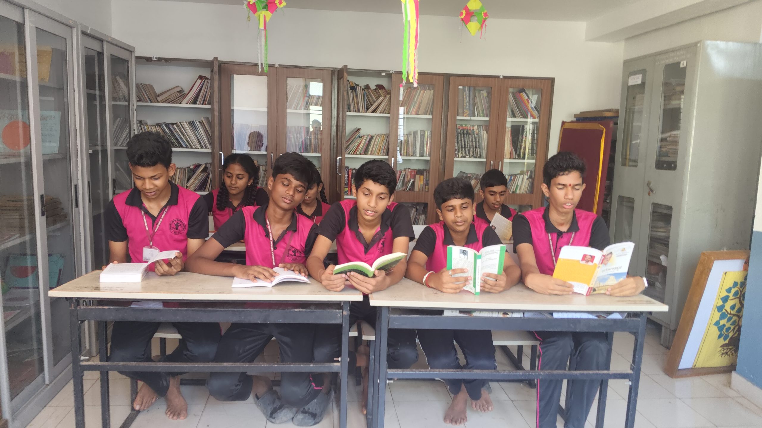 Our school has a library and it contains more than 8000 books. There are two Kannada newspapers and One English Newspapers and magazines. Students make good use of the library and reading room.