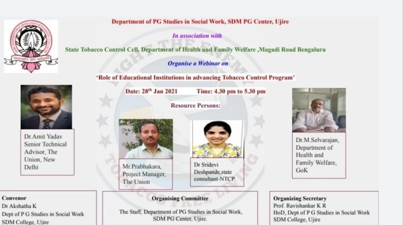 Department of PG Studies in Social Work,SDM PG Center,Ujire in association with State Tobacco Control Cell,Department of Health and Family Welfare Magadi Road Bengaluru Organise a Webinar On ‘Role of Educational Institution in advancing Tobacco Control Program’ on 28th Jan 2021-01-27 Time: 4.30 pm to 5.30 pm. Resource Persons of the webinar were Dr.M.Selvarajan, Deputy Director(Medical)...Read More