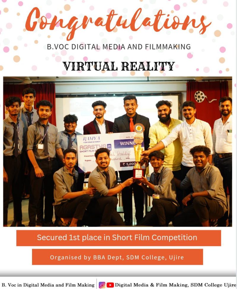 ‘Virtual Reality’ a short movie produced and created by the students of B.Voc in Digital Media and Film Making has won the first place at ‘Agastya’, a short film competition organized by the department of BBA and the Hobby Circle at SDM College Ujire. Out of seven finalists, the team has won the first place....Read More