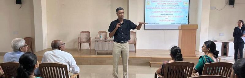The Department of PG Studies and Research in Chemistry, in association with the Placement and Progression committee, organized a Pool campus Drive by Anthem Biosciences Pvt. Ltd. Bangalore, here at SDM PG Centre today. Dr. Sumesh Eswaran, Dy. General Manager, Process R&D; Prasad B.R., Dy. General Manager, Analytical R&D, and QC; and Shankar Bhat, Manager,...