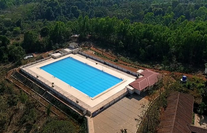 A swimming pool conforming to International Standard (50 X 25 meters) with an area of 33,660 sq. ft. for the use of students, staff and general public. The students are trained in various styles of swimming for a nominal fee. Several swimming competitions are regularly conducted here