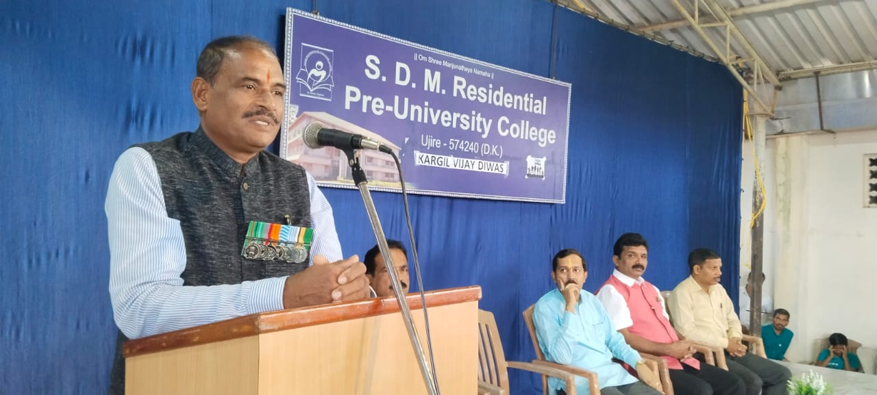 ಕಾಲೇಜಿನಲ್ಲಿ ನಡೆದ ‘ಕಾರ್ಗಿಲ್ ವಿಜಯ ದಿವಸ’ ಆಚರಣೆಯ ಮುಖ್ಯ ಅತಿಥಿಯಾಗಿ ಆಗಮಿಸಿ ತಾವು ಸೈನಿಕನಾಗಿದ್ದಾಗ ಮೆರೆದ ಸಾಹಸವನ್ನು ಎಳೆ ಎಳೆಯಾಗಿ ಬಿಚ್ಚಿ ವಿದ್ಯಾರ್ಥಿಗಳಿಗೆ ವಿವರಿಸಿದರು.’ಜೈ ಜವಾನ್ ಜೈ ಕಿಸಾನ್ ನನ್ನ ಮೂಲ ಮಂತ್ರವಾಗಿದೆ ನಿವೃತ್ತಿ ಬಳಿಕ ಕೃಷಿಕನಾಗಿದ್ದೇನೆ ಎಂದರು. ಕಾರ್ಯಕ್ರಮದಲ್ಲಿ ಅತಿಥಿಯಾಗಿದ್ದ ಕಾಲೇಜಿನ ದೈಹಿಕ ಶಿಕ್ಷಕ ಹಾಗೂ ಮಾಜಿ ಸೈನಿಕ ಲಕ್ಷ್ಮಣ್ ಜಿ.ಡಿಯವರು ಕಾರ್ಗಿಲ್ ಬಗ್ಗೆ ಪೂರ್ಣ ಮಾಹಿತಿ ನೀಡಿದರು. ಕಾರ್ಗಿಲ್ ಕದನ ಸಮಯ ಅಲ್ಲೇ ಇದ್ದ ತಮ್ಮ ಅನುಭವ ಹಂಚಿಕೊಂಡರು.