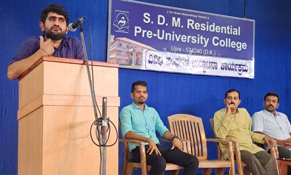 ಶ್ರೀ ಧರ್ಮಸ್ಥಳ ಮಂಜುನಾಥೇಶ್ವರ ವಸತಿ ಪದವಿಪೂರ್ವ ಕಾಲೇಜಿನಲ್ಲಿ ಹಮ್ಮಿಕೊಂಡಿದ್ದ ‘ ವಿವಿಧ ಸಂಘಗಳ ಉದ್ಘಾಟನ ಕಾರ್ಯಕ್ರಮದಲ್ಲಿ ಮುಖ್ಯ ಅತಿಥಿಯಾಗಿ ವಿವೇಕಾನಂದ ಕಾಲೇಜಿನ ಭೌತಶಾಸ್ತ್ರ ಸಹಾಯಕ ಪ್ರಾಧ್ಯಾಪಕ ಡಾ| ಶ್ರೀಶ ಭಟ್ ಮಾತನಾಡಿದರು. ವಿವಿಧ ಸಂಘಗಳು ಕ್ರಿಯಾಶೀಲವಾಗಿ ಉತ್ತಮ ವಿಭಿನ್ನ ಕಾರ್ಯಕ್ರಮಗಳನ್ನ ಸಂಘಟಿಸುವಂತಾಗಲಿ,ಶಿಸ್ತು ಎಲ್ಲದಕ್ಕೂ ಮಾನದಂಡವಾಗಲಿ ಎಂದು ಕಾರ್ಯಕ್ರಮದ ಅಧ್ಯಕ್ಷತೆ ವಹಿಸಿದ್ದ ಕಾಲೇಜಿನ ಪ್ರಾಂಶುಪಾಲರಾದ ಸುನಿಲ್ ಪಂಡಿತ್ ಹೇಳಿದರು.