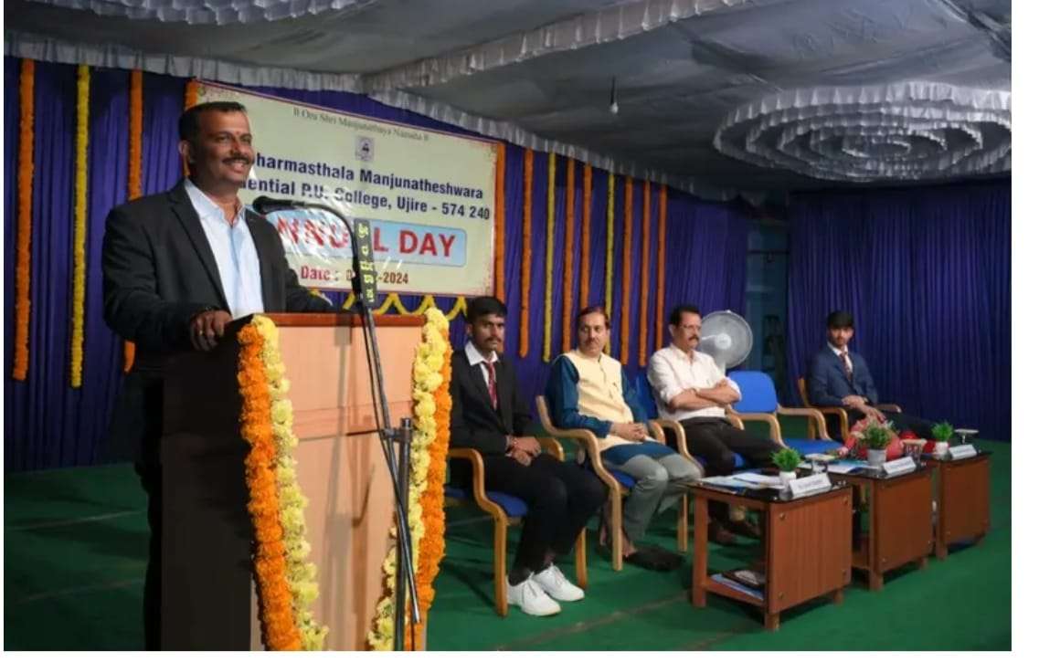 The annual day celebration of SDM Residential PU College, Ujire, was held with great enthusiasm. The chief guest for the event was Dr. Raghavendra Holla N, President of Swastika National School of Business, Mangalore. In his inspiring speech, he emphasized the importance of value-based education along with academic learning. He stated, “When we pursue our goals with clarity and determination, we achieve what we aim for. Every student possesses unique talents and individuality, so never compare yourself with others. Focus on consistent efforts.” He also narrated the remarkable life story of Arunima Sinha, the second woman to climb Mount Everest, to motivate students towards achieving excellence. The event was presided over by Dr. Satishchandra S, Secretary of SDM institutions. In his address, he highlighted the college’s commitment to achieving outstanding results and fostering the all-round development of students. He praised the students for their discipline, learning mindset, and enthusiasm for sports and encouraged them to reach greater heights in this competitive era.