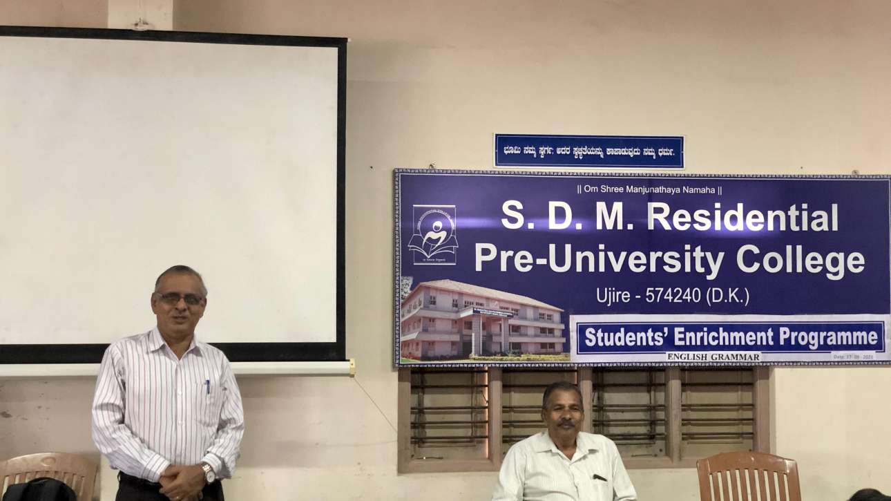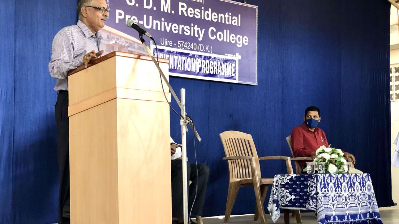 Orientation programme for first year PUC was done on 18 Jan 2021 in SDM Residential PU College Ujire. Dr.T.Krishnamurthy oriented regarding covid rules and regulations. Mr.Manish Kumar Vice principal seen on stage.
