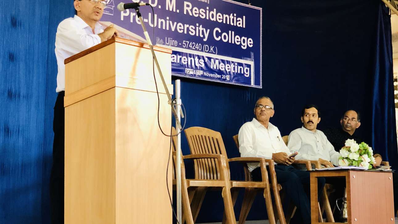 Mr.Narayan Bhat T veteran speaker spoke on how parents should react with their children and shared his experience as a teacher during parent teacher meeting which was held in SDM Residential PU College, Ujire on 22nd & 23rd Nov 2019 for I PUC as well as II PUC. Dr.T.Krishnamurthy being a president of the function spoke on how parents should encourage their children during their exam time.
