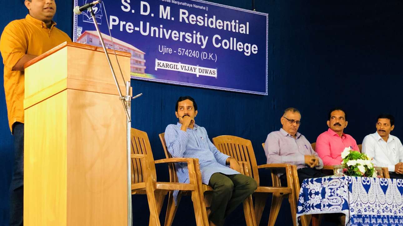 Mr. Achyuth Kamath Lecturer SDM College Ujire delivered a talk to mark the occasion Kargil Vijay Diwas in SDM Residential PU College Ujire on 26 July 2019. He cherished his experience about his visit to Kargil and talked about soldiers’ sacrifice for India. IIPU students performed a dance to show their respect to Nation and Jawans. Dr.T.Krishnamurthy Principal, Sunil Pandit, Manish Kumar were seen on the stage.