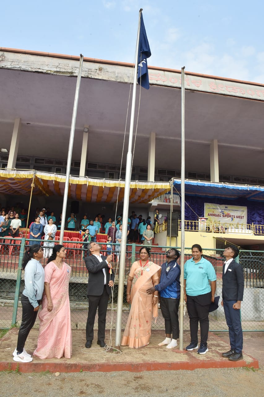 The Annual sports day for grades 4-10 of Shri Dharmasthala Manjunatheshwara School, Ashoknagar, was held on Tuesday, December 10, at Mangala Stadium, Mannagudda. The inauguration ceremony was graced by the chief guest, Dr. Narendra Shetty, Chief Health Officer of SDM Kshemavana, Bengaluru. The event commenced with a prayer by the students, followed by a march-past by five teams and the hoisting of the flag. The school principal, Mrs. Joy Jeevan Rai, delivered the welcome address, emphasizing the importance of sports and their role in promoting healthy development among students. The inauguration was made unique by bringing the torch via a drone and lighting the sports flame by the athletic champions, as per tradition. The Deputy Sports Minister, Sanvi Shetty, took the sports pledge. Chief guest Dr. Narendra Shetty explained how sports contribute to mental well-being and extended his best wishes to the students. Mrs. Usha Hegde, the Academic Coordinator, proposed the vote of thanks. The event featured impressive sports drills by the students. Competitions were also organized for parents, teachers, and non-teaching staff. During the closing ceremony, the school correspondent, Mrs. Shrutha Jitesh, presented prizes to the winners and awarded the championship trophy to the Amethyst team. A moment of silence was observed to mourn the demise of former Chief Minister S.M. Krishna. Teachers Mrs. Margaret and Arunita served as the masters of ceremonies for the event.